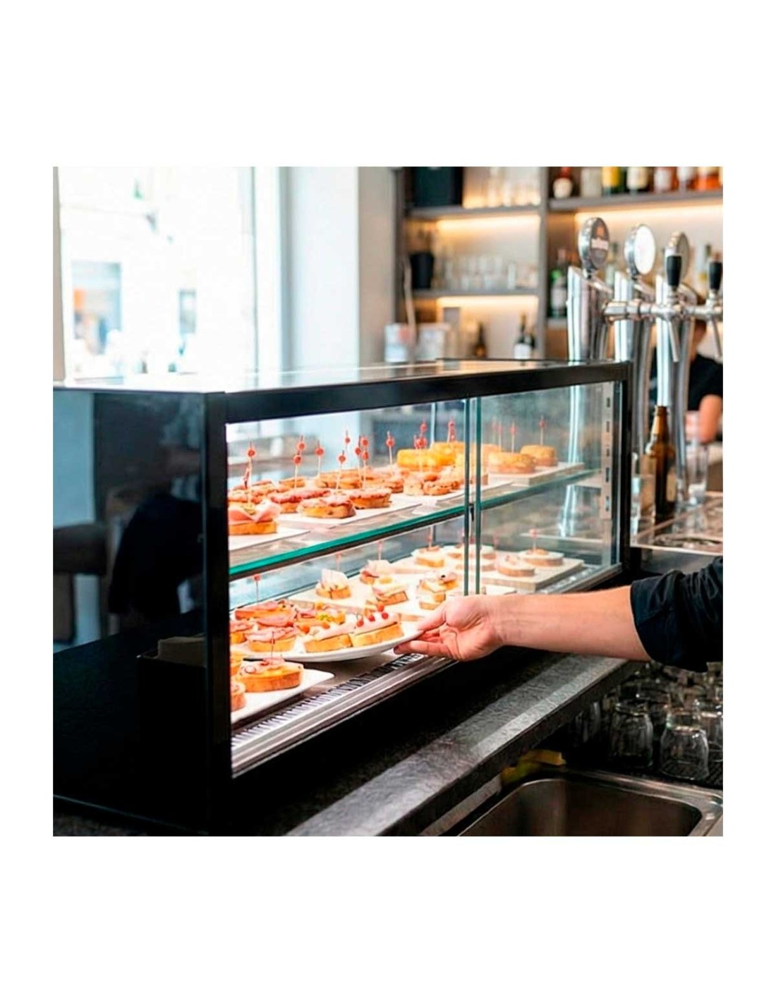 Dispone de dos niveles de exposición con iluminación LED superior y en cada altura, que realzan la presentación de tapas, postres, bebidas o productos fríos.