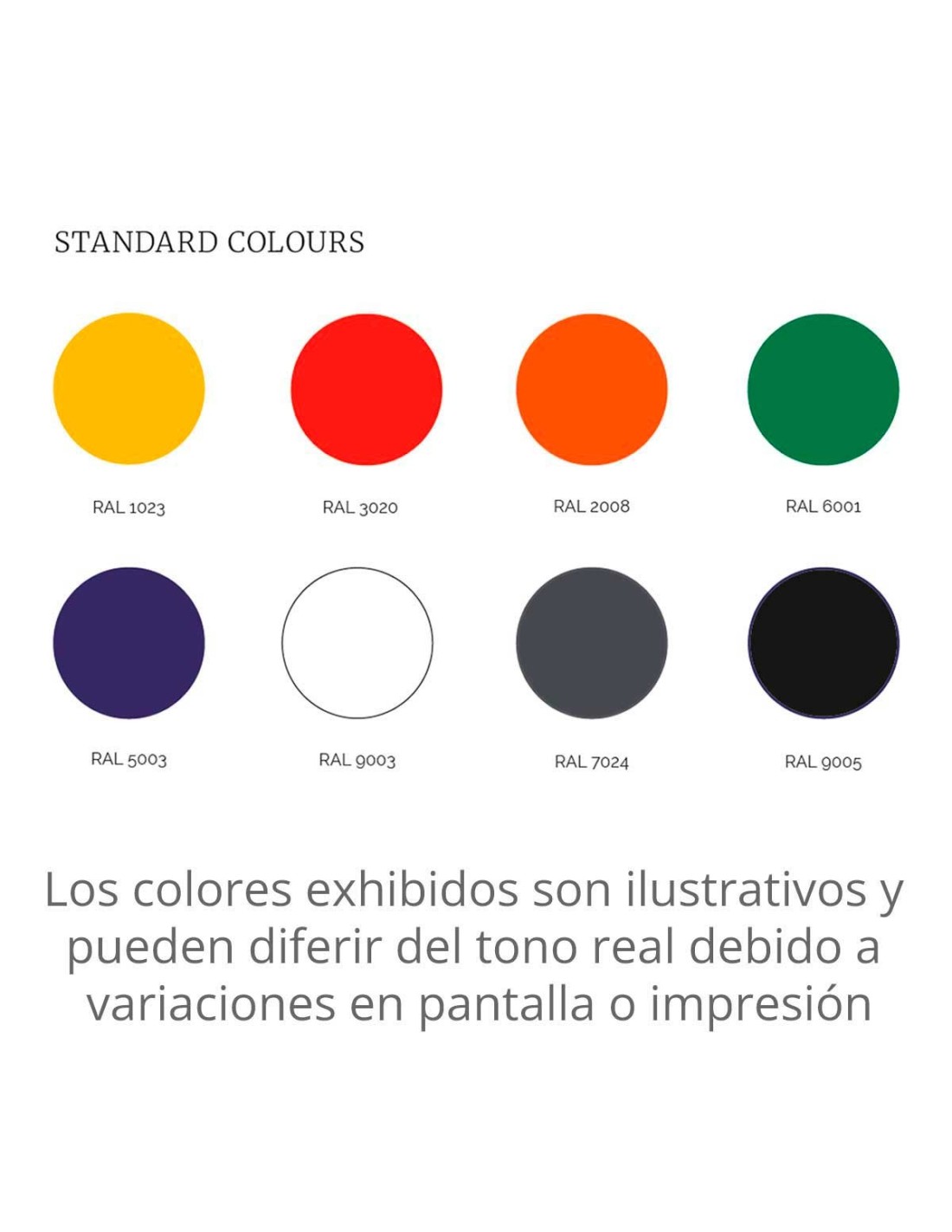 amarillo, rojo, naranja, verde, azul, blanco, gris grafito y negro.