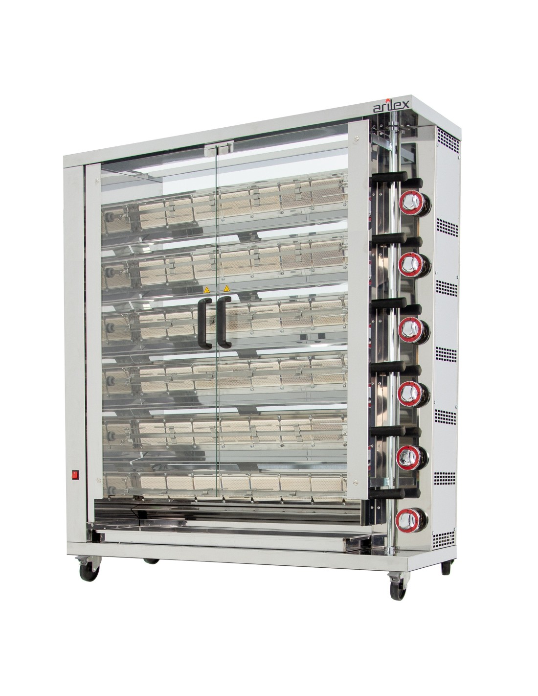 El asador 6ASG de ARILEX tiene la transmisión por cadena y engranajes de gran calidad. Los quemadores son independientes de gran poder calorífico con termopar de seguridad.