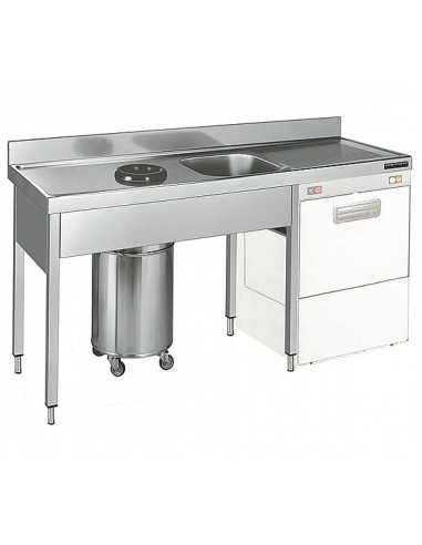 Dispone de una encimera con cubeta embutida y un orificio con aro de goma, que permite desechar restos directamente en un cubo de basura situado bajo la encimera, optimizando el trabajo en cocinas de alta rotación.