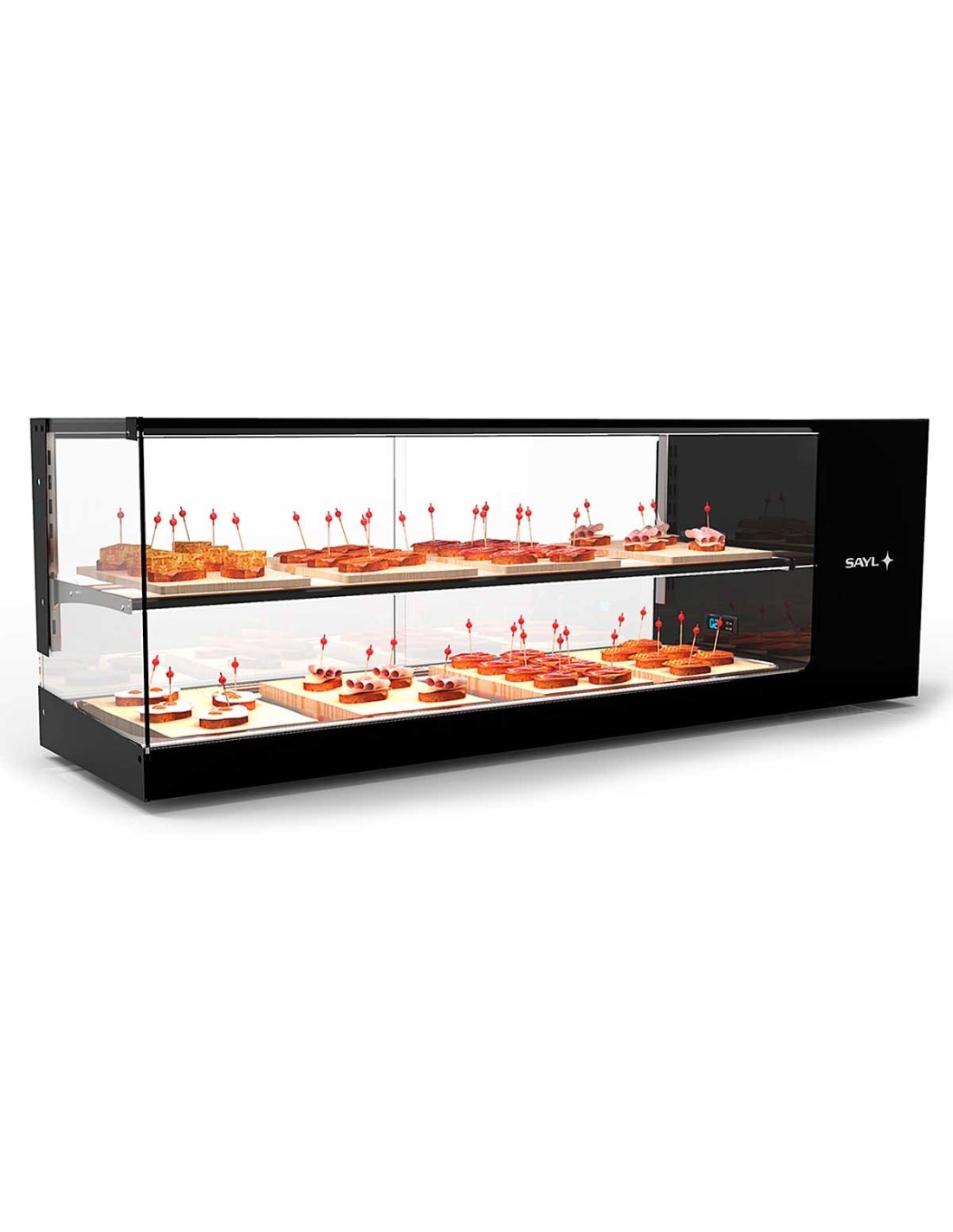 Dispone de dos niveles de exposición con iluminación LED superior y en cada altura, que realzan la presentación de tapas, postres, bebidas o productos fríos.
