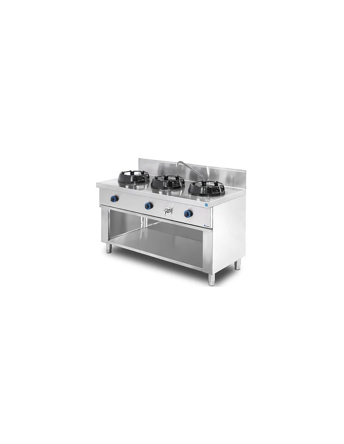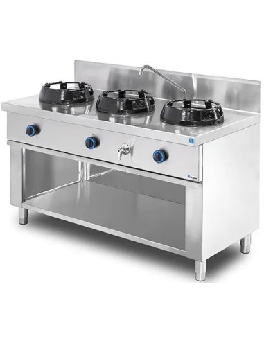 Cocina wok asiática profesional de 3 fuegos con quemadores de 14 kW cada uno. Fabricada en acero inox AISI 304-SAT, con grifo de agua integrado, muro antisalpicaduras y recogegotas. Apta para gas natural o GLP. Ideal para cocinas orientales.