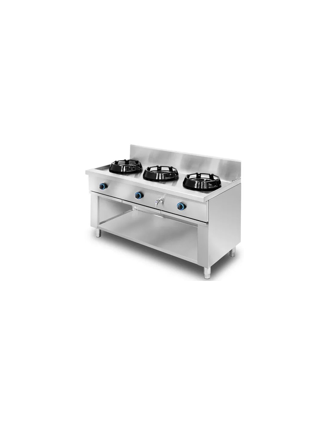 La Cocina Wok Asiática Estándar de 3 Fuegos es una estufa profesional diseñada para la cocina oriental tradicional y moderna, combinando potencia, durabilidad e higiene.
