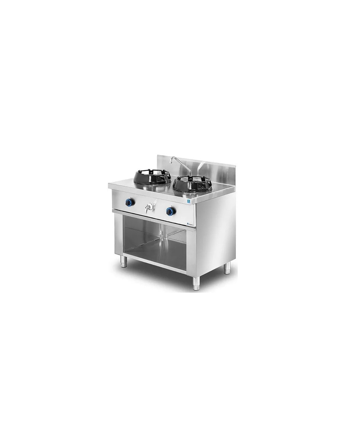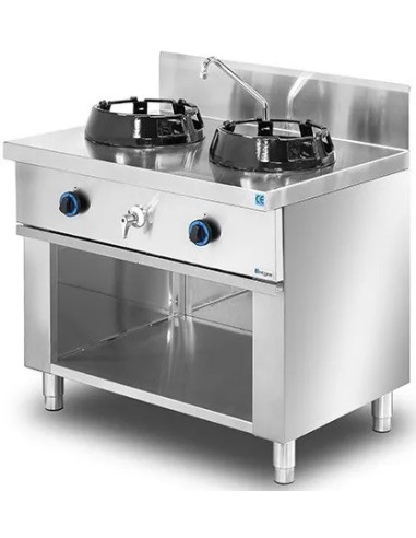 Cocina wok asiática profesional de 2 fuegos con quemadores de 14 kW cada uno. Fabricada en acero inox AISI 304-SAT con grifo de agua, muro antisalpicaduras y recogegrasas. Apta para gas natural o GLP. Ideal para cocinas orientales.