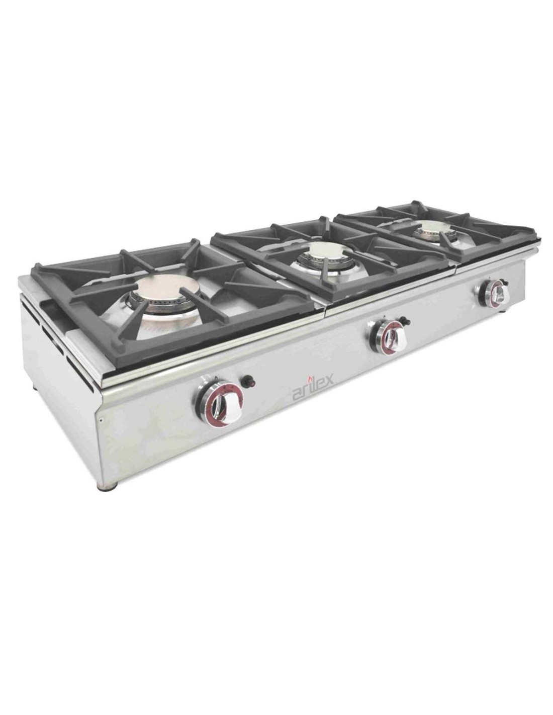La Cocina a Gas Arilex 120CGN es un modelo de sobremesa con tres fogones potentes y estructura en acero inoxidable. Ideal para cocinas profesionales con espacio limitado. Puede convertirse en plancha fácilmente mediante una placa de acero laminado, ofreciendo gran versatilidad y durabilidad.