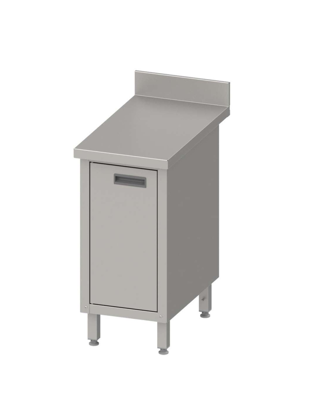 Mesa de trabajo mural fabricada en acero inoxidable, con puerta batiente y peto sanitario.Con patas de tubo regulables en altura.