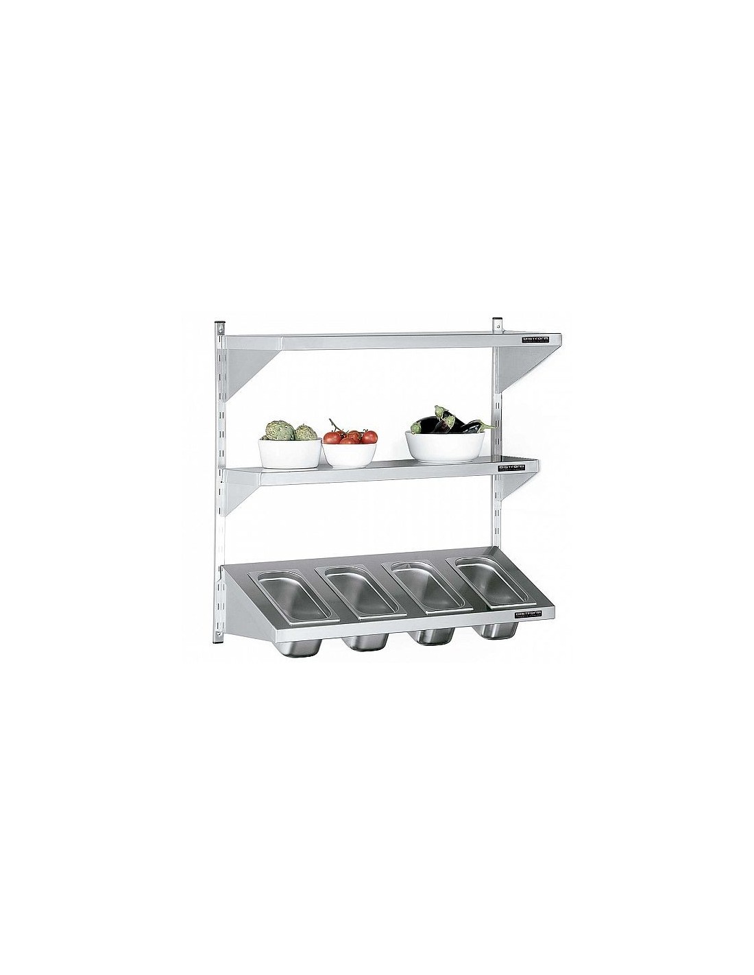 La Estantería de Pared Regulable 250 de Distform es una estantería mural profesional en acero inoxidable AISI 304 con fondo de 25 cm y estantes regulables. Incluye estante inclinado para cubetas GN 1/6 y se adapta a cocinas profesionales, obradores y zonas de preparación, ofreciendo organización, resistencia e higiene en espacios compactos.