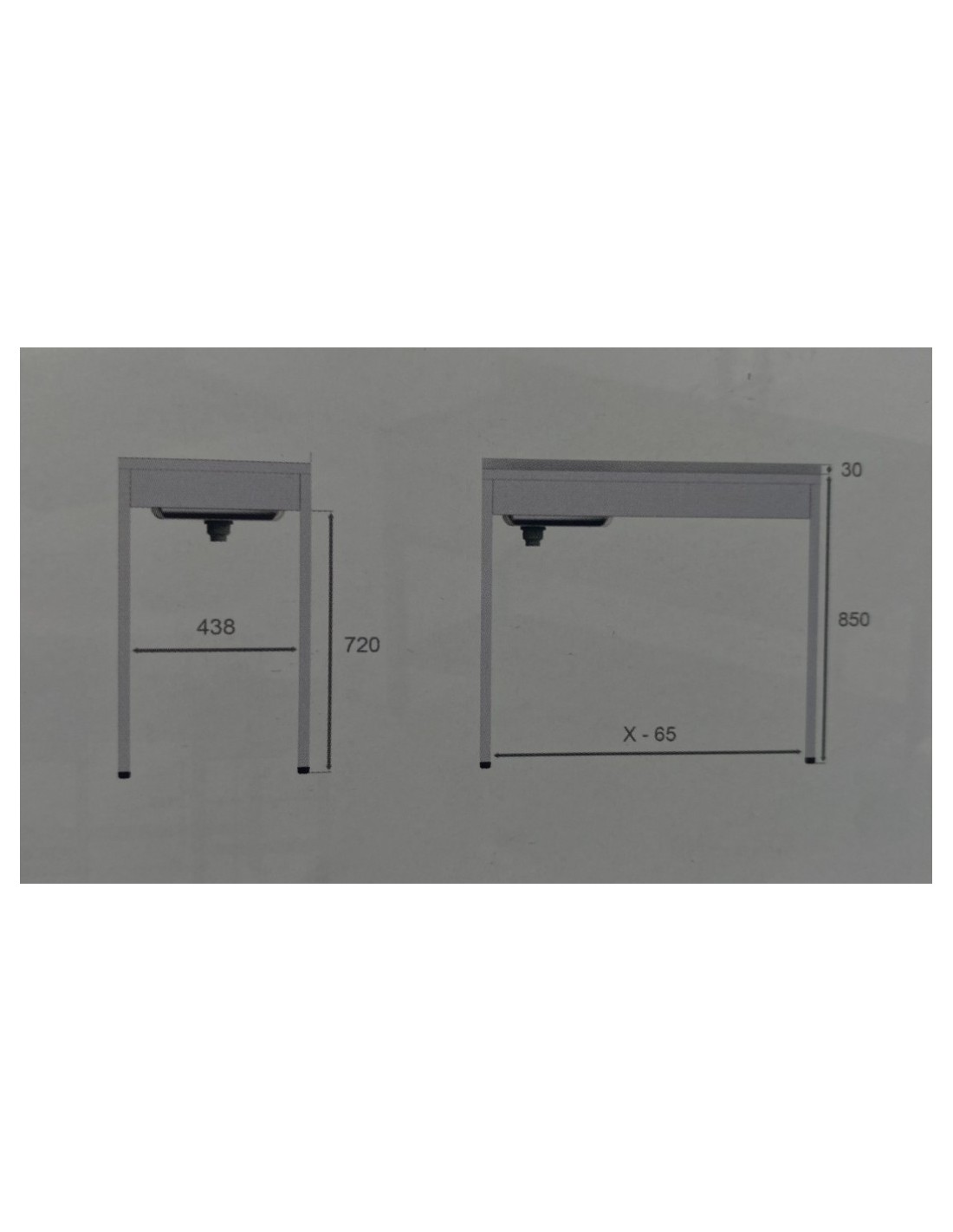 Patas de acero inoxidable con tubo 30 × 30 mm (modelos Gama 500), equipadas con tacos regulables en altura mediante rosca oculta, permitiendo ajustar la altura de trabajo de 85 a 93 cm.