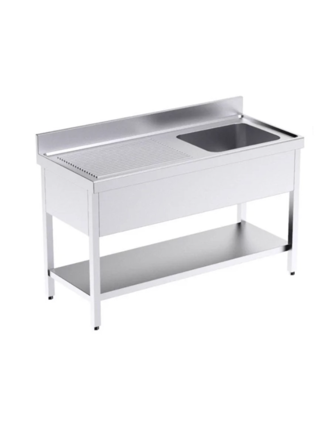 Fregadero de acero inoxidable AISI 304 con peto posterior de 100 mm y agujero de desbarace con aro de goma preparado para poder incorporar un cubo de basura para desperdicios debajo.