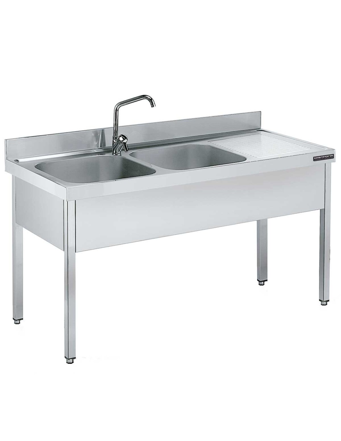 Fregadero fabricado en acero inoxidable, equipado con escurridor y dos cubas embutidas con válvula de desagüe. Diseñada sin estantes, ofrece una solución práctica y funcional para zonas de lavado profesionales. Disponible en varios tamaños para adaptarse a distintas necesidades.