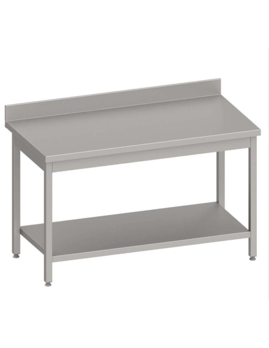 La Mesa de Trabajo Mural Gama 600 con 1 Estante de Clima hosteleria está diseñada para ofrecer resistencia, funcionalidad y durabilidad en entornos profesionales. Fabricada en acero inoxidable satinado AISI 304 18/10, incorpora un peto posterior de 10,5 cm y patas cuadradas regulables en altura, lo que garantiza estabilidad y una excelente higiene en la zona de trabajo.