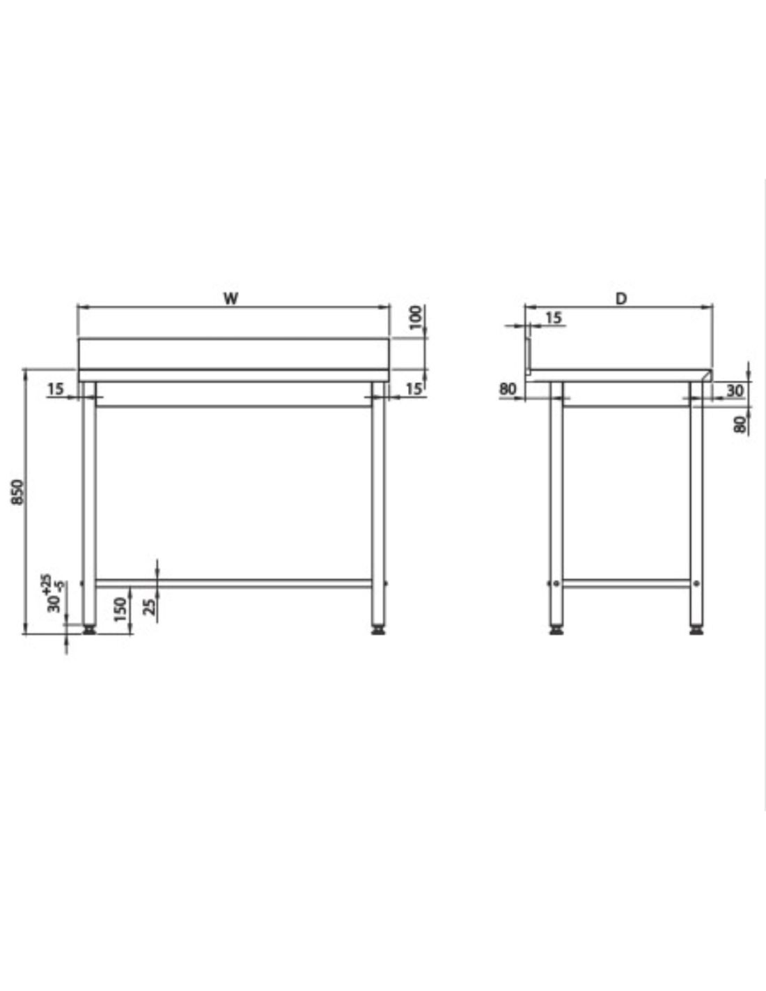 Mesa de trabajo Mural con peto sanitario de 10 cm de acero inoxidable AISI 201 con patas de tubo cuadrado 40x40mm regulables.Fondo 600 alto 850. se suministran desmontadas
