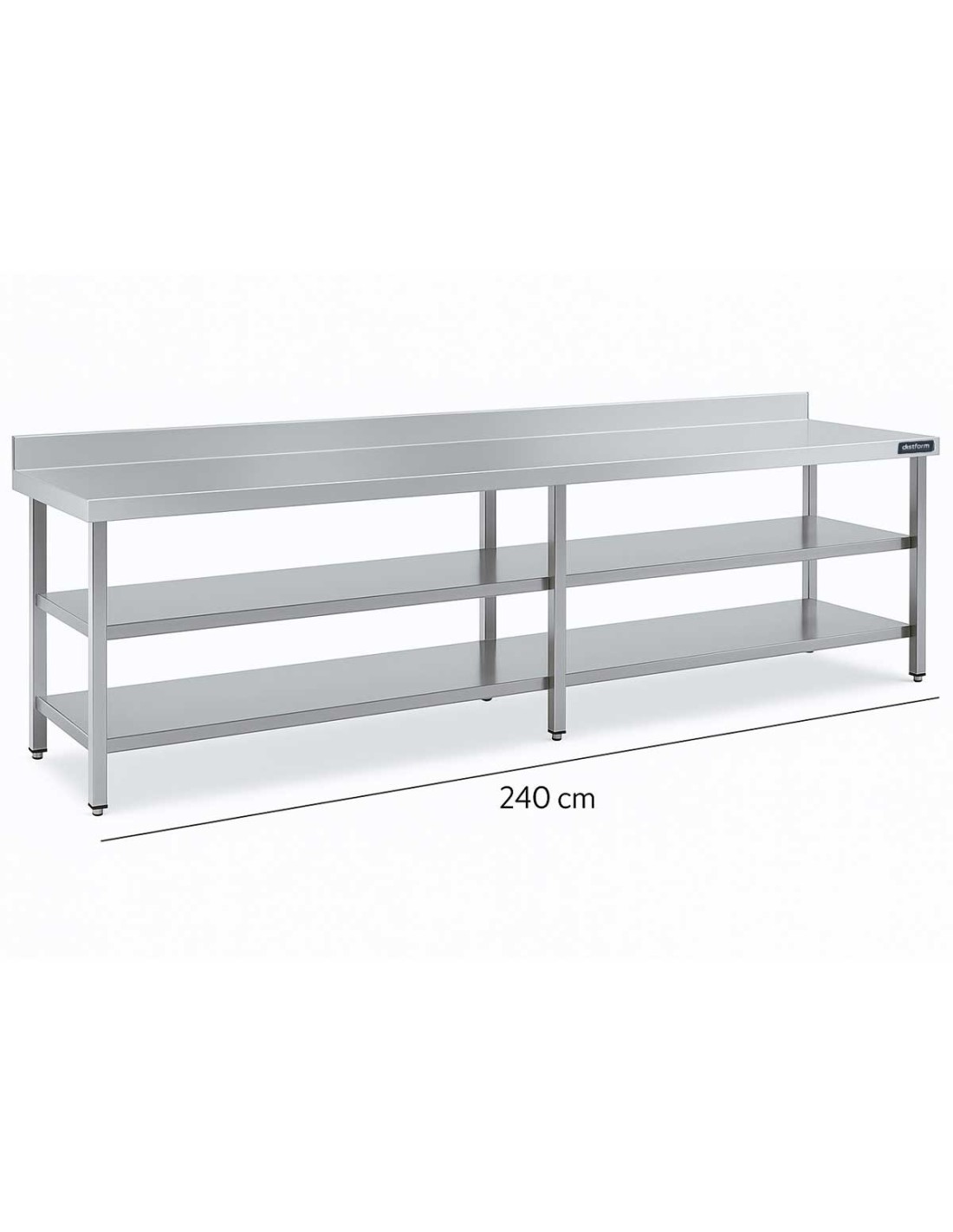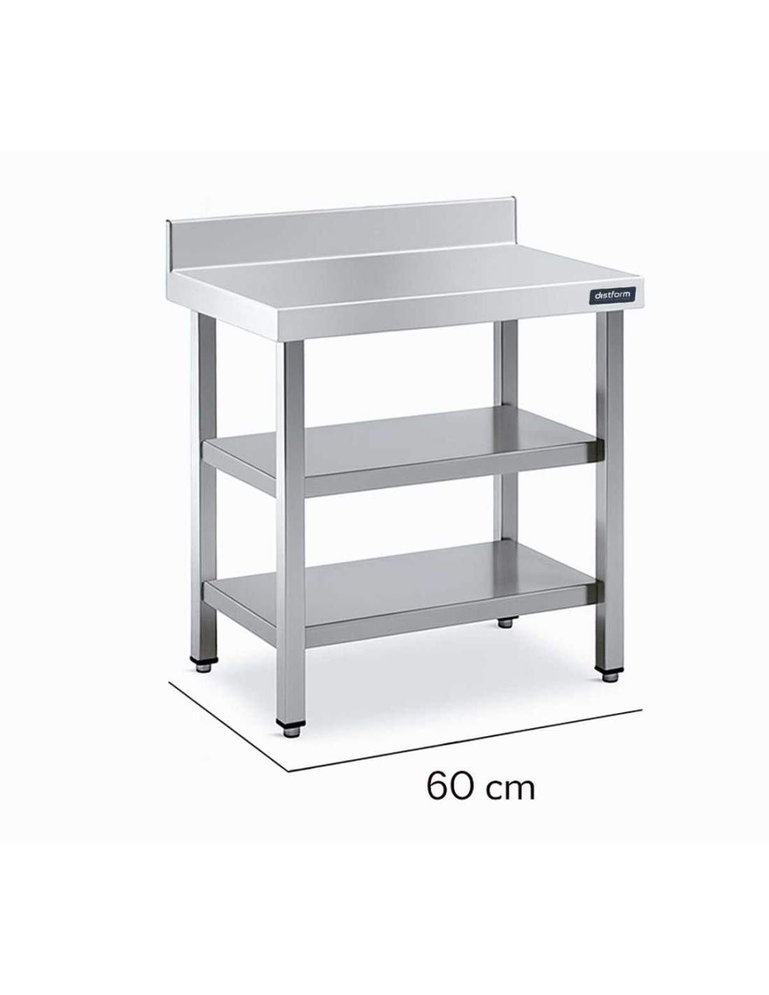 La Mesa de Trabajo Mural Gama 600 con 2 Estantes de Distform está fabricada en acero inoxidable satinado, diseñada para un uso intensivo en cocinas profesionales. Incorpora cuatro patas cuadradas regulables en altura y peto posterior de 10,5 cm, que protege la pared y mejora la higiene del espacio de trabajo.