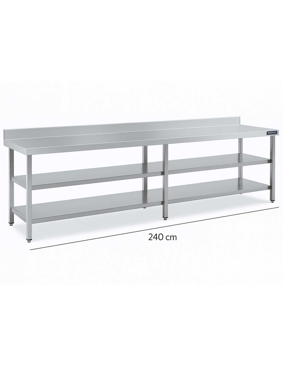 La Mesa de Trabajo Mural Gama 700 con 2 Estantes de Distform está diseñada para un uso intensivo en cocinas profesionales, ofreciendo una estructura robusta, funcional y fácil de limpiar. Fabricada íntegramente en acero inoxidable satinado, incorpora cuatro patas cuadradas regulables en altura que garantizan estabilidad y adaptación a cualquier superficie de trabajo.