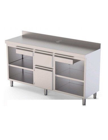 El Mueble Cafetero Aveiro CST60200 de Clima Hostelería es ideal para barras y zonas de café profesionales. Fabricado en acero inoxidable AISI 304, con 2 cajones con cierre suave, 1 puerta y tolva para café extraíble, combina robustez y funcionalidad. Sus pies regulables y la encimera con orificio para tubos facilitan la instalación y el uso diario. Disponible en 3 tamaños: 150, 200 y 250 cm. Perfecto para hostelería, cafeterías y espacios de trabajo intensivo.