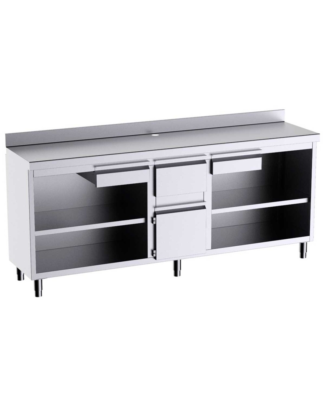La encimera reforzada con omegas de acero inoxidable permite soportar el peso de equipos de café sin deformaciones, y la parte trasera parcialmente abierta facilita la instalación y conexión de tuberías. Con peto trasero de 10,5 cm, frontal de 6,5 cm y patas regulables, este mueble se adapta a cualquier entorno profesional. Se entrega montado y listo para usar.