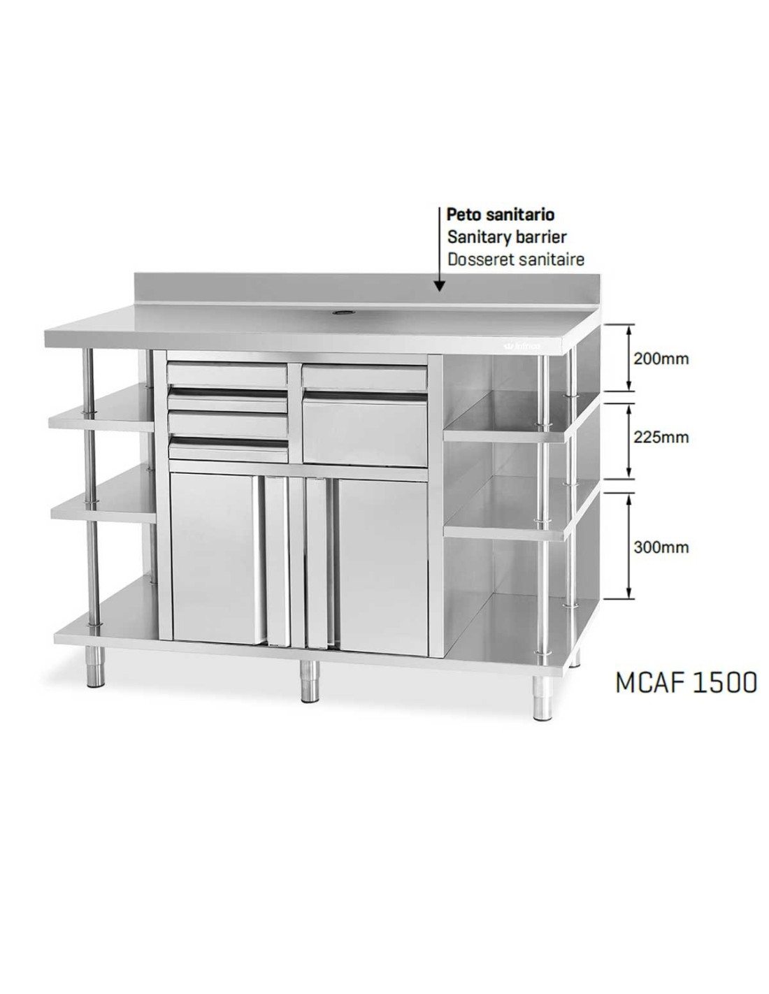 El Mueble Mesa Cafetera MCAF 2500 de Infrico es la solución ideal para cafeterías y bares profesionales. Fabricado en acero inoxidable AISI 304, combina resistencia, higiene y funcionalidad. Incluye 2 cajones, 2 puertas, 1 tolva con tirador integrado y estantes laterales para organizar utensilios y productos. La encimera cuenta con orificio para cables y tubos y peto sanitario de 10 cm, ofreciendo seguridad y comodidad en el trabajo diario.