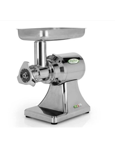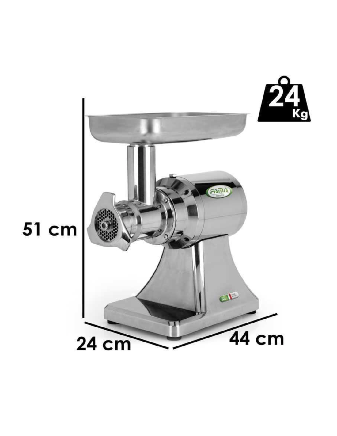Picadora profesional estructurada en aleación de aluminio fundido a presión, equipada con engranajes en baño de aceite y motor ventilado con protección térmica. Ideal para producciones de hasta 300 kg/h. Dimensiones: 240 × 440 × 510 mm.
