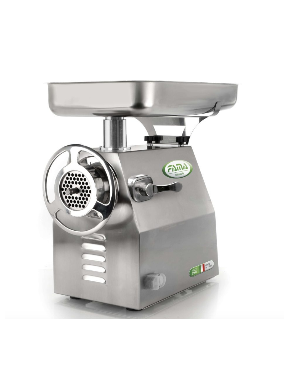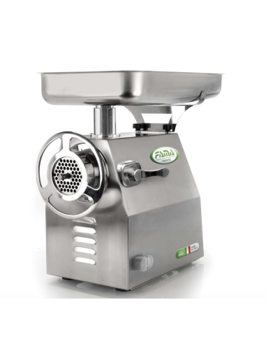 Picadora profesional de alto rendimiento para carnicerías y supermercados. Construida completamente en acero inoxidable AISI 304, con reductor hermético en baño de aceite y producción de hasta 500 kg/h. Dimensiones: 260 × 510 × 525 mm.