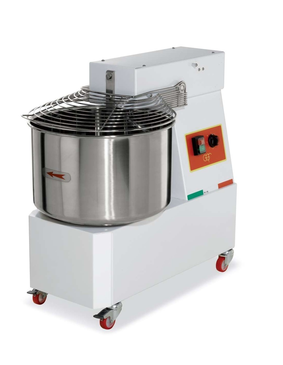Amasadora espiral con cuba y cabezal fijo ideal para masas de gran consistencia tales como pizza o pan.Recomendado especialmente para restaurantes panaderías y hoteles. dotadas de ruedas y fabricados en acero todos los elementos que entran en contacto con la masa.