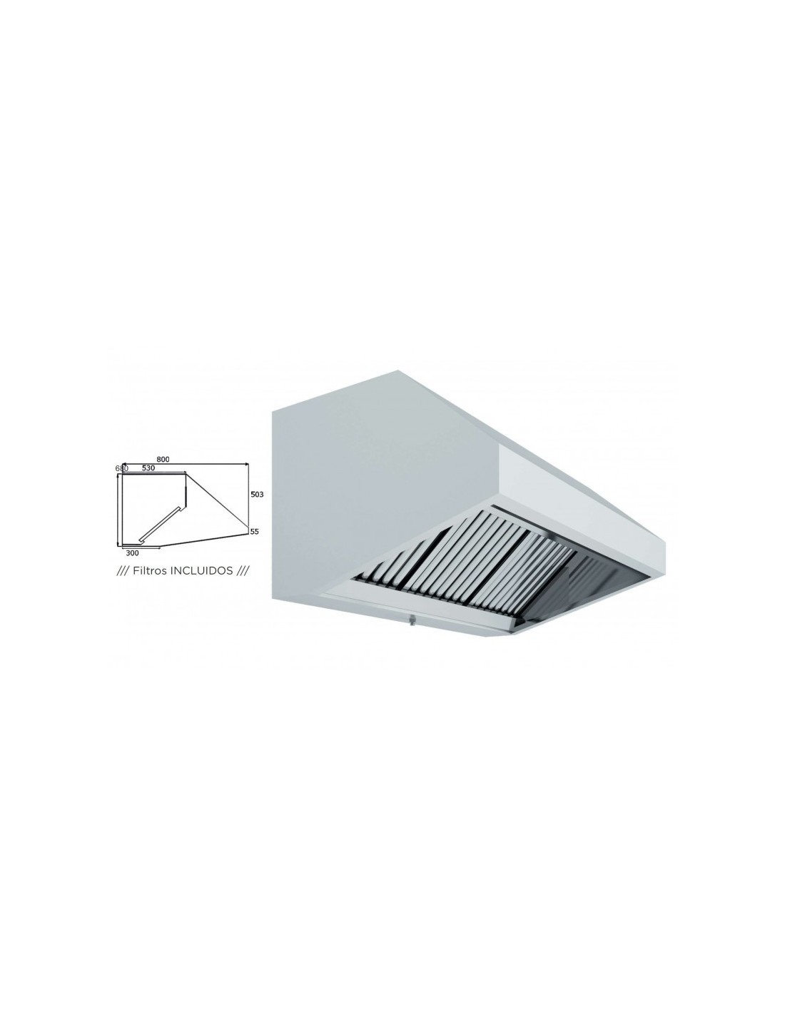 Campana mural profesional fabricada en acero inoxidable AISI 430, con filtros inclinados 45°, colectores de fácil limpieza y depósito de grasa integrado. Cumple todas las normativas de extracción de humos y está diseñada para cocinas de hostelería, bares y restaurantes.