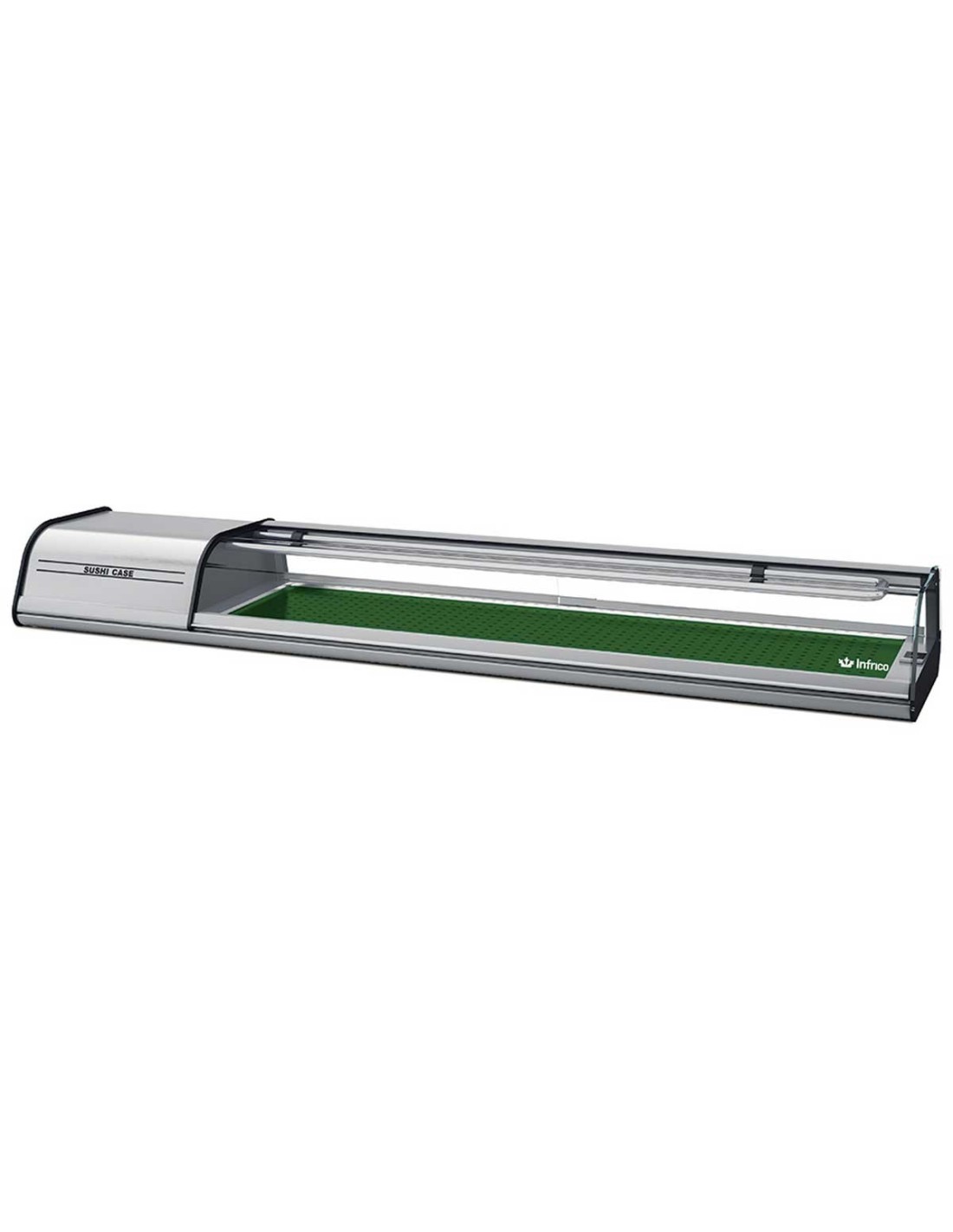 La Vitrina Refrigerada de Sushi Infrico VSU mantiene los alimentos entre –1 °C y +7 °C con frío ventilado y refrigerante ecológico R290a. Fabricada en acero inoxidable AISI-304 con cristal curvo elevable e iluminación LED. Disponible en modelos de 126, 162 y 197 cm, con capacidades de 9,2 a 15,5 litros. Ideal para sushi, pescado y marisco.